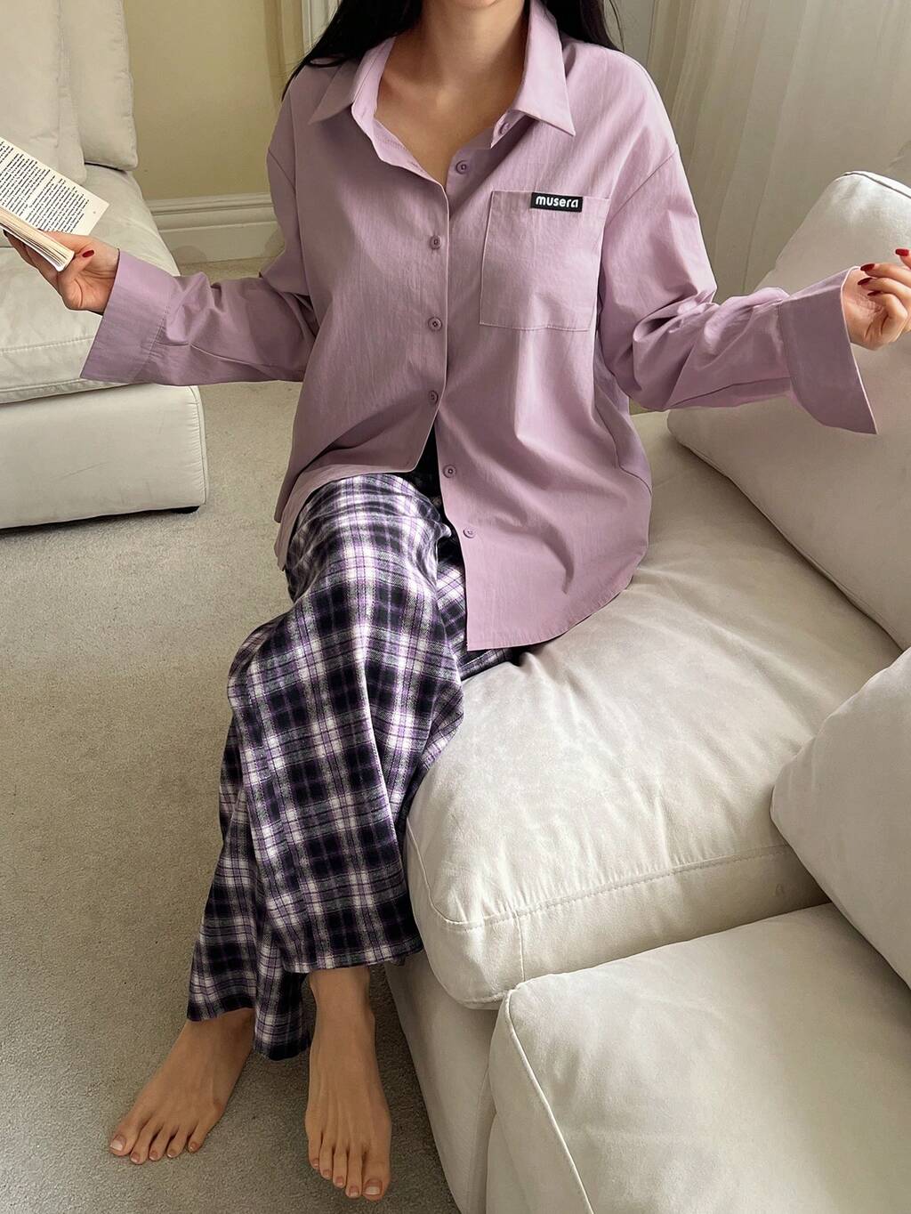 Letter Embroidered Decor Shirt Style Top & Loose Plaid Pajama Pants Women Sleepwear Set, Fall & Winter Clothes
