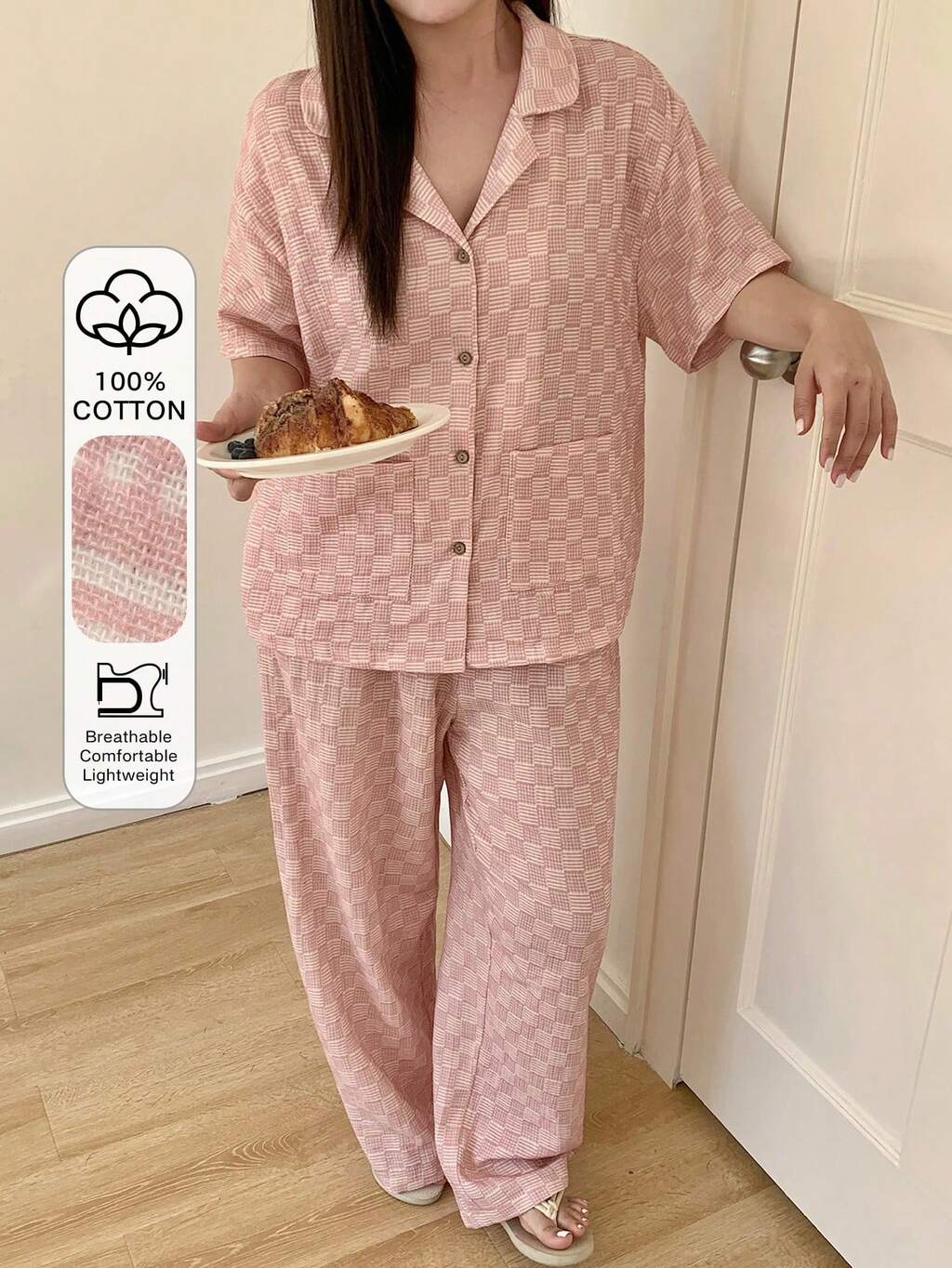 Dazy Plus Plus Size Comfortable Plaid Shirt And Pants Pajama Set, Summer