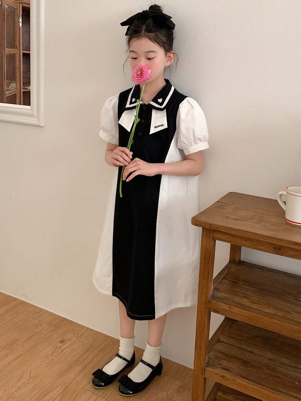 Tween Girls Colorblock Lapel Short Sleeve Casual Dress, Summer