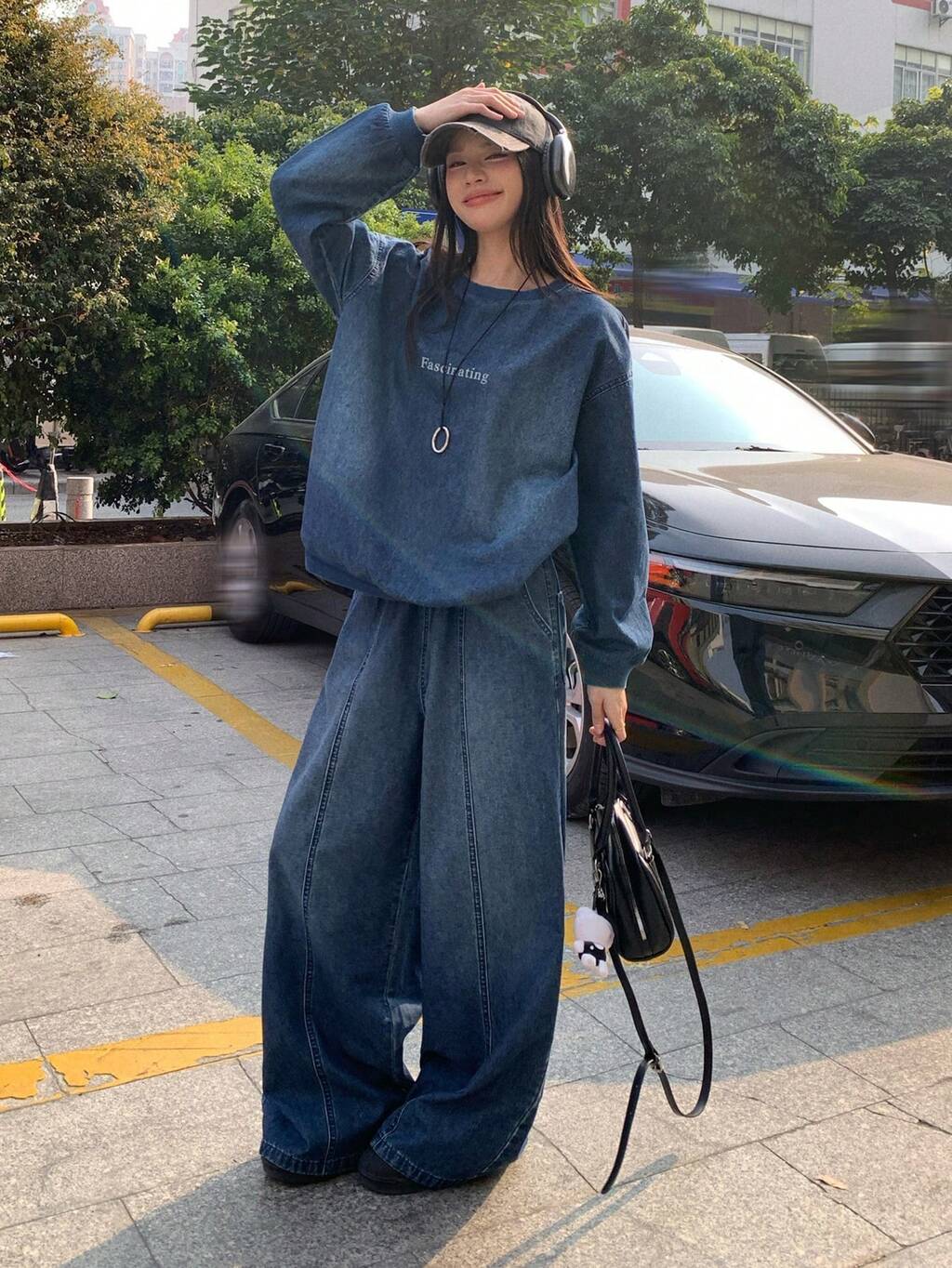 Women's Korean Style Round Neck Washed Denim Top And Loose Fit Denim Pants Set