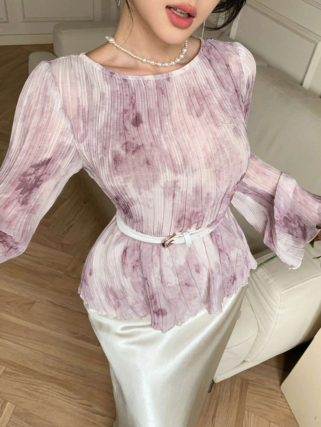 French Retro Printed Round Neck T-Shirt, Flared Sleeve Design, Fitted Women Top