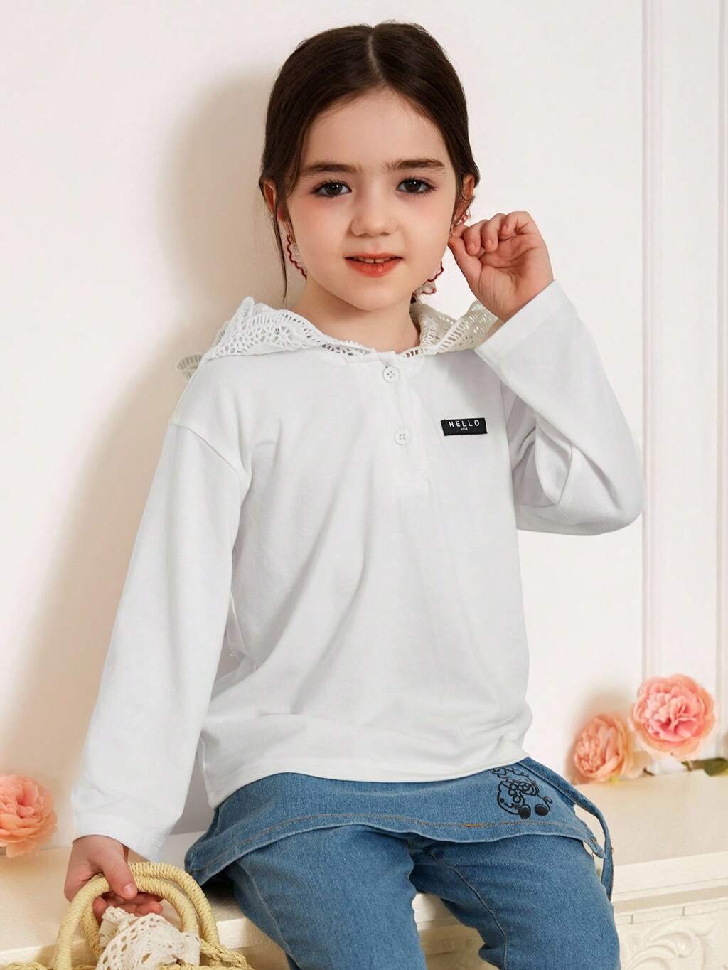 Young Girl Embroidered Lace Panel Casual Long Sleeve T-Shirt Fall, Winter