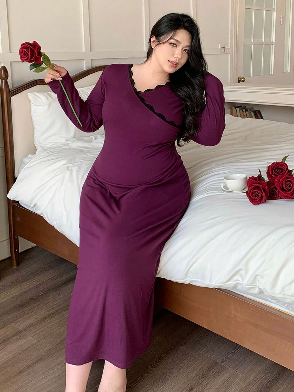 Dazy Plus Plus Size Women Contrast Lace Bodycon Sexy Long Nightgown, Elegant Sleepwear For Spring & Autumn