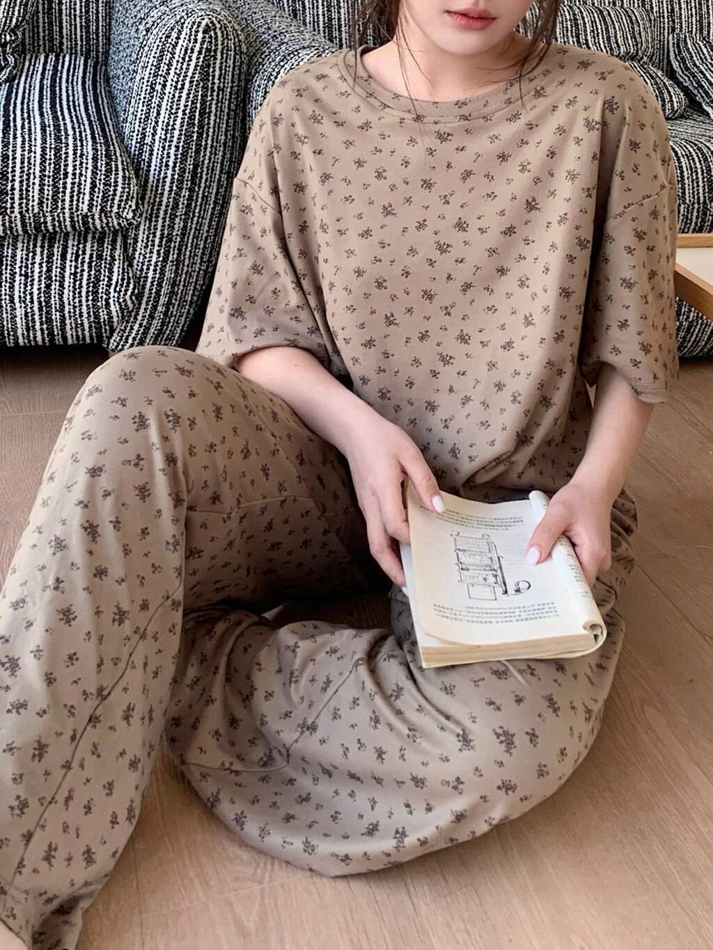 Ditsy Floral Loose Fit Short Sleeve Top And Pants Pajama Set