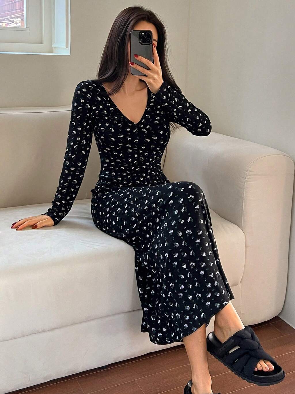 Ditsy Floral Fitted Deep V-Neck Pleated Design Long Nightgown, Pajama, Fall, Winter