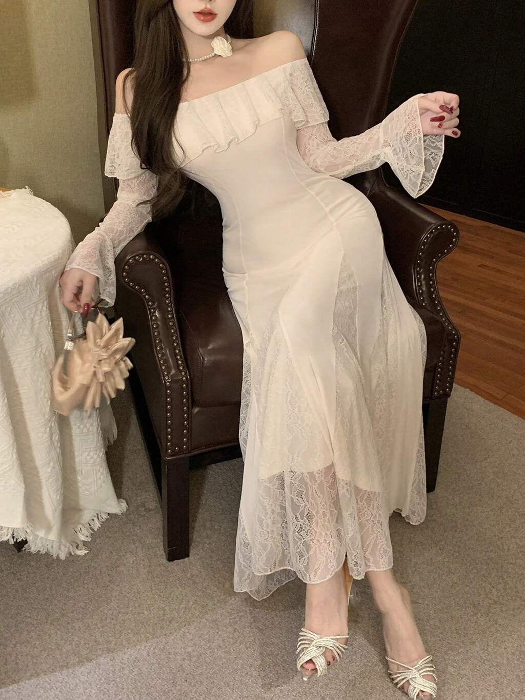 Women's Open Shoulder Lace Splice Mermaid Hem Dress, Birthday Prom Dress,Fall Dress Long Sleeve Dress Elegant Women Dresses Maxi Dress