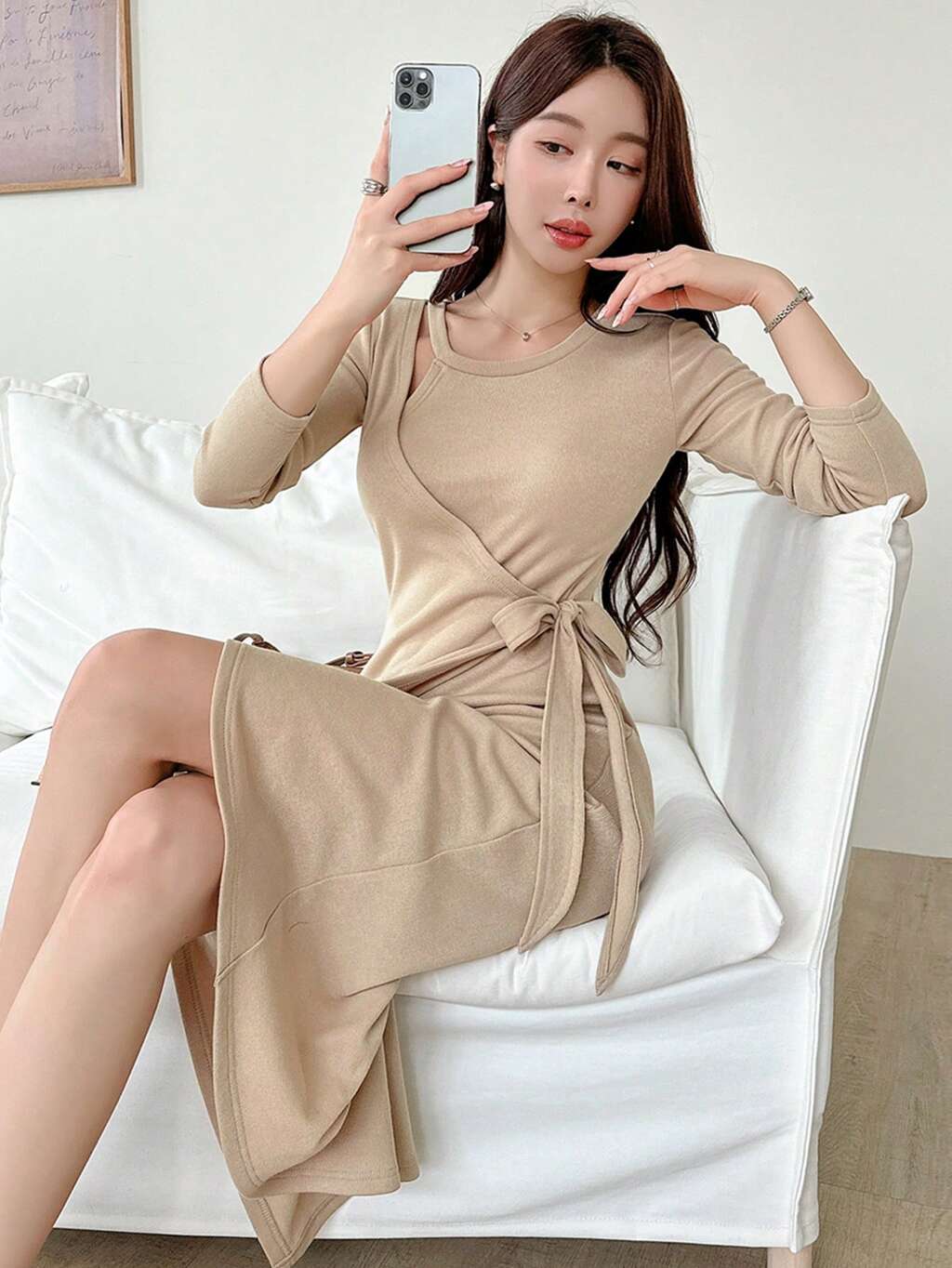 Women's Solid Color Wrap Around Waist Tie Long Sleeve Dress, Elegant Design For Spring And Fall