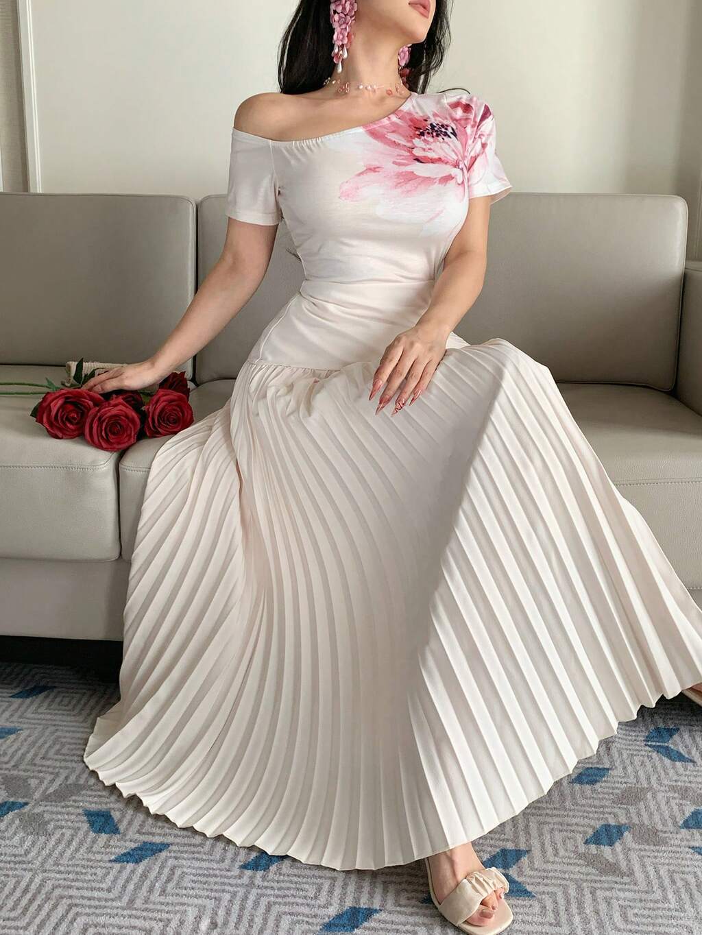 Women's Elegant Printed Pleated Asymmetric Shoulder Dress, Summer Wedding Guest Dress Sundress