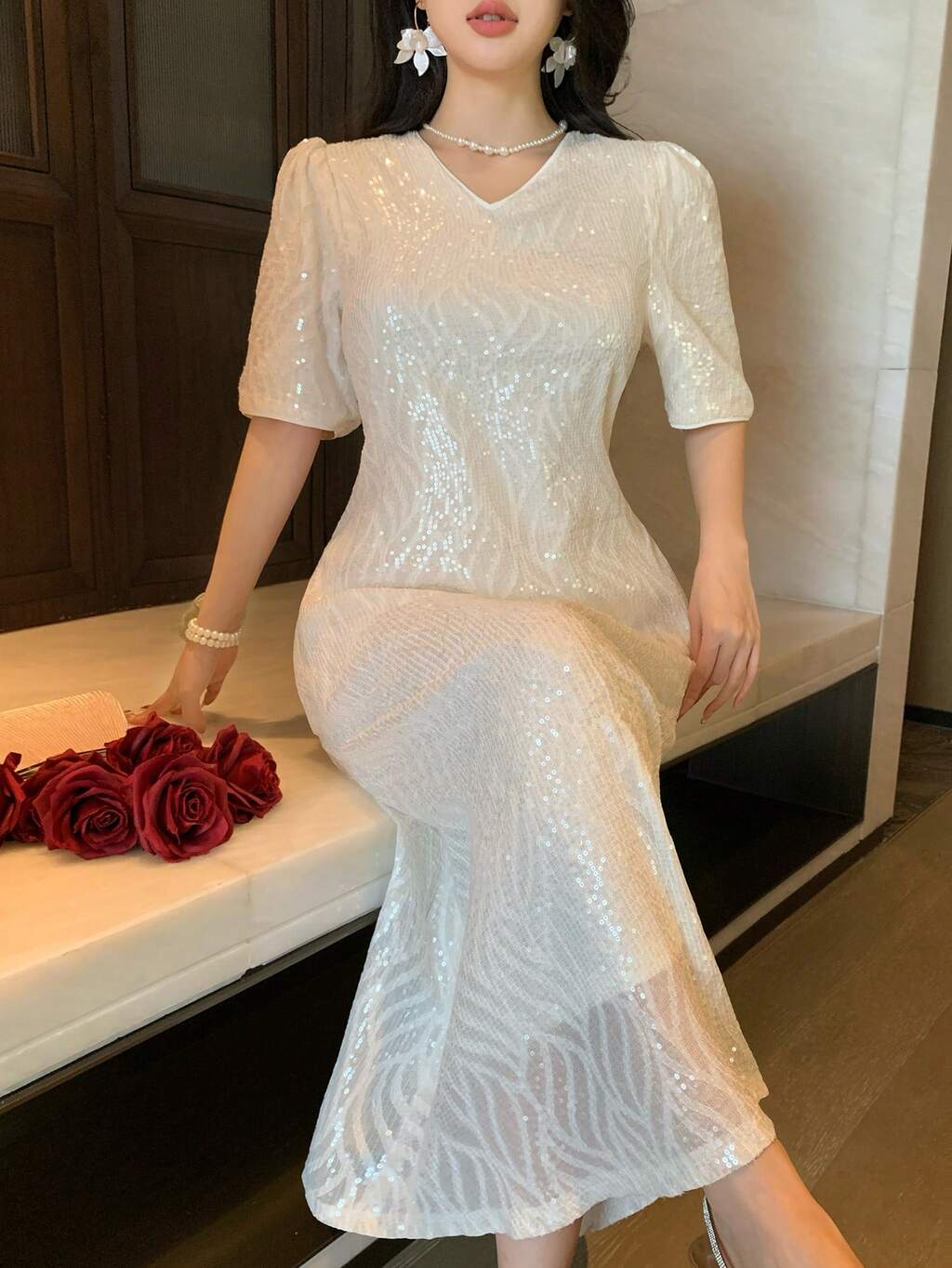 Women's Elegant Sequin Textured V-Neck Petal Sleeve Straight Long Dress, Spring/Summer,Wedding Guest Dress Women Sundress