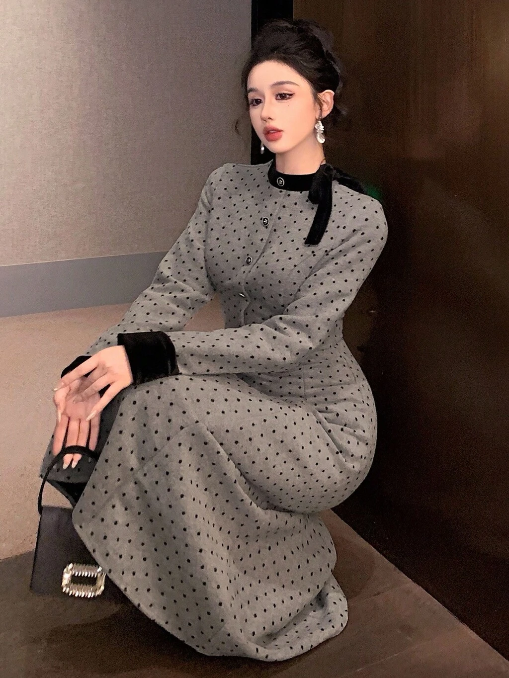 Autumn/Winter Woolen Fabric Waist Cinched Dress, All-Over Polka Dot Print, Contrast Color Ribbon Collar, Metal Button Closure, Loose Fit Elegant Work/Wedding/Party Dress, A-Line Midi Dress For Women