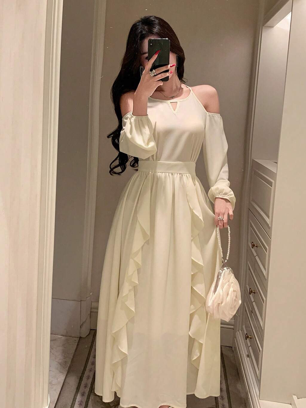 Solid Open Shoulder Ruched Mid-Calf Dress For Women Elegant Sundress,Fall Dress Long Sleeve Dress