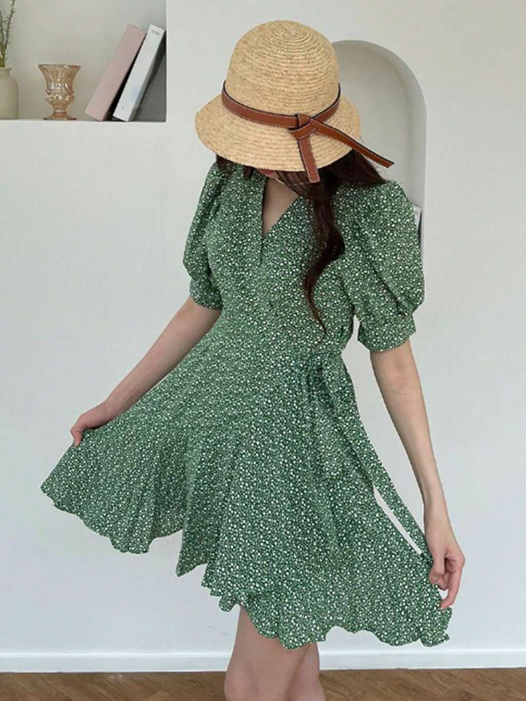 Women Summer Short Bubble Sleeve Ditsy Floral Waist Tie Holiday Style Dress Sundress Vacation Outfits Women Easter