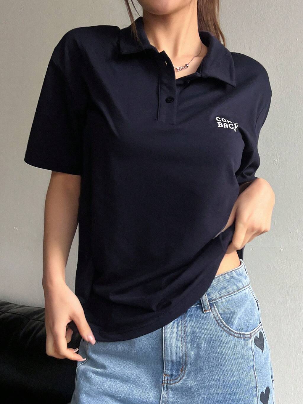 Lapel Half Placket Loose Short Sleeve Women's T-Shirt With Letter Print,Fall Clothes Preppy Tops