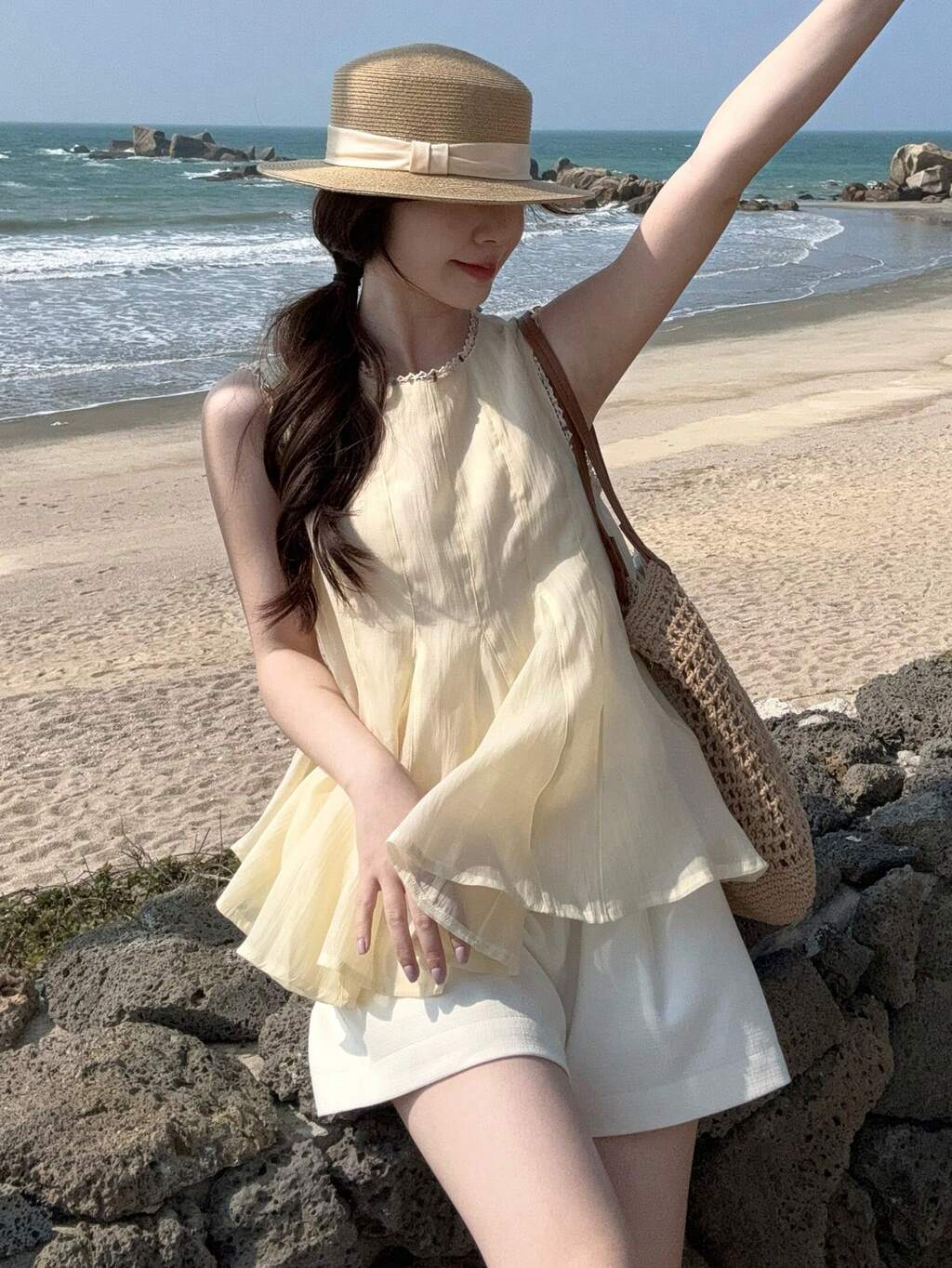 Women's Contrast Lace Round Neck Ruffle Hem Sleeveless Fashion Blouse