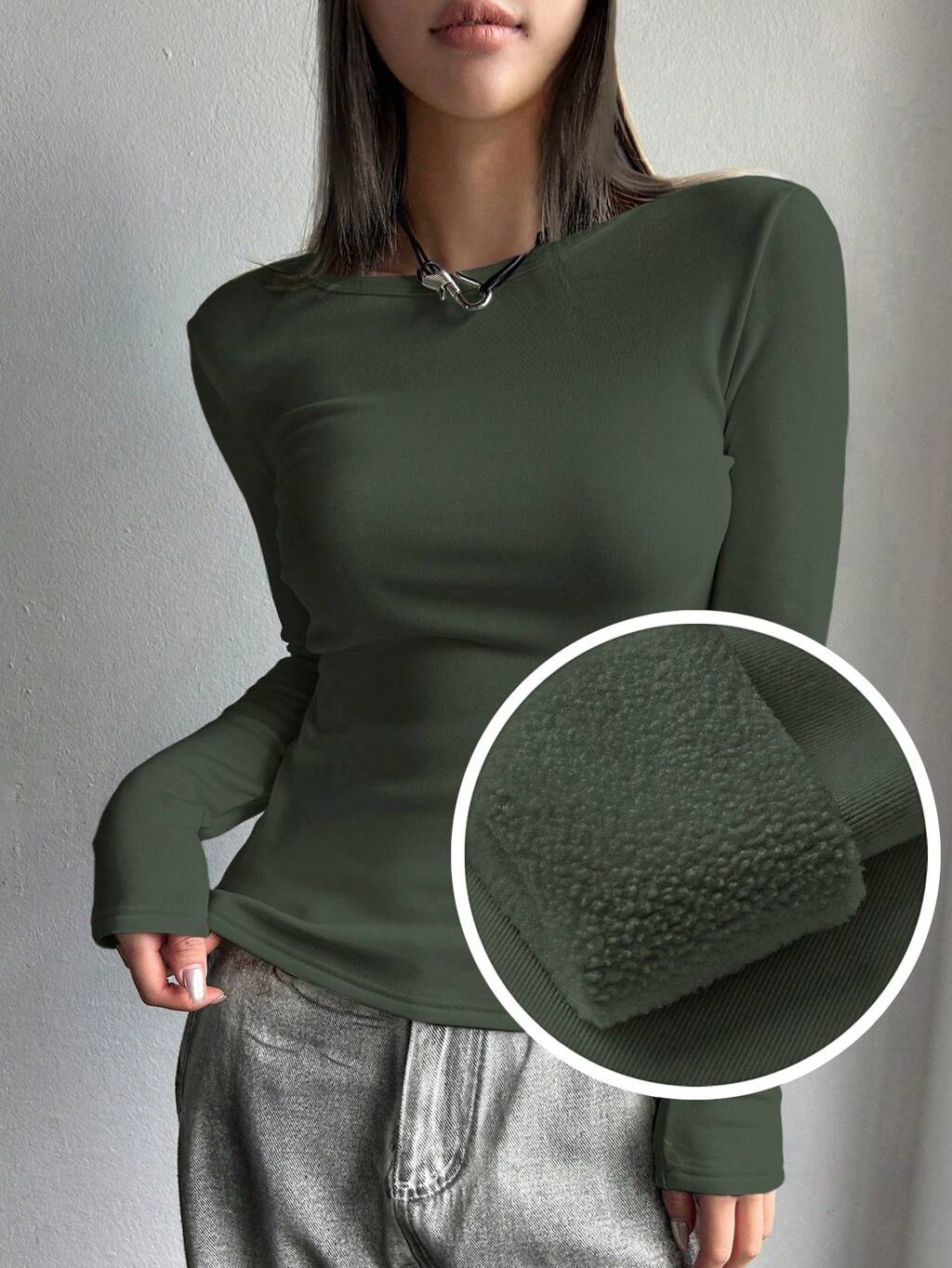 Solid Round Neck Thermal Tee Long Sleeve Women Tops,Thermal Lined Fall,Winter