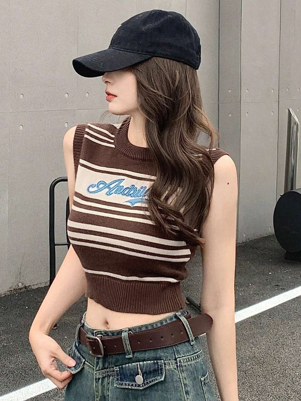 Ladies' Colorblock Striped Embroidered Letter Sleeveless Sweater Vest,Fall Clothes