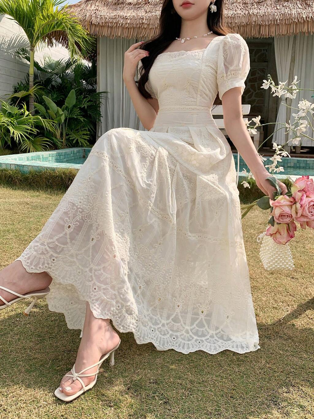 Women's Embroidered Puff Sleeve Midi Dress, Elegant Waist Cinched, Suitable For Dates And Parties Wedding Guest Dress Sundress