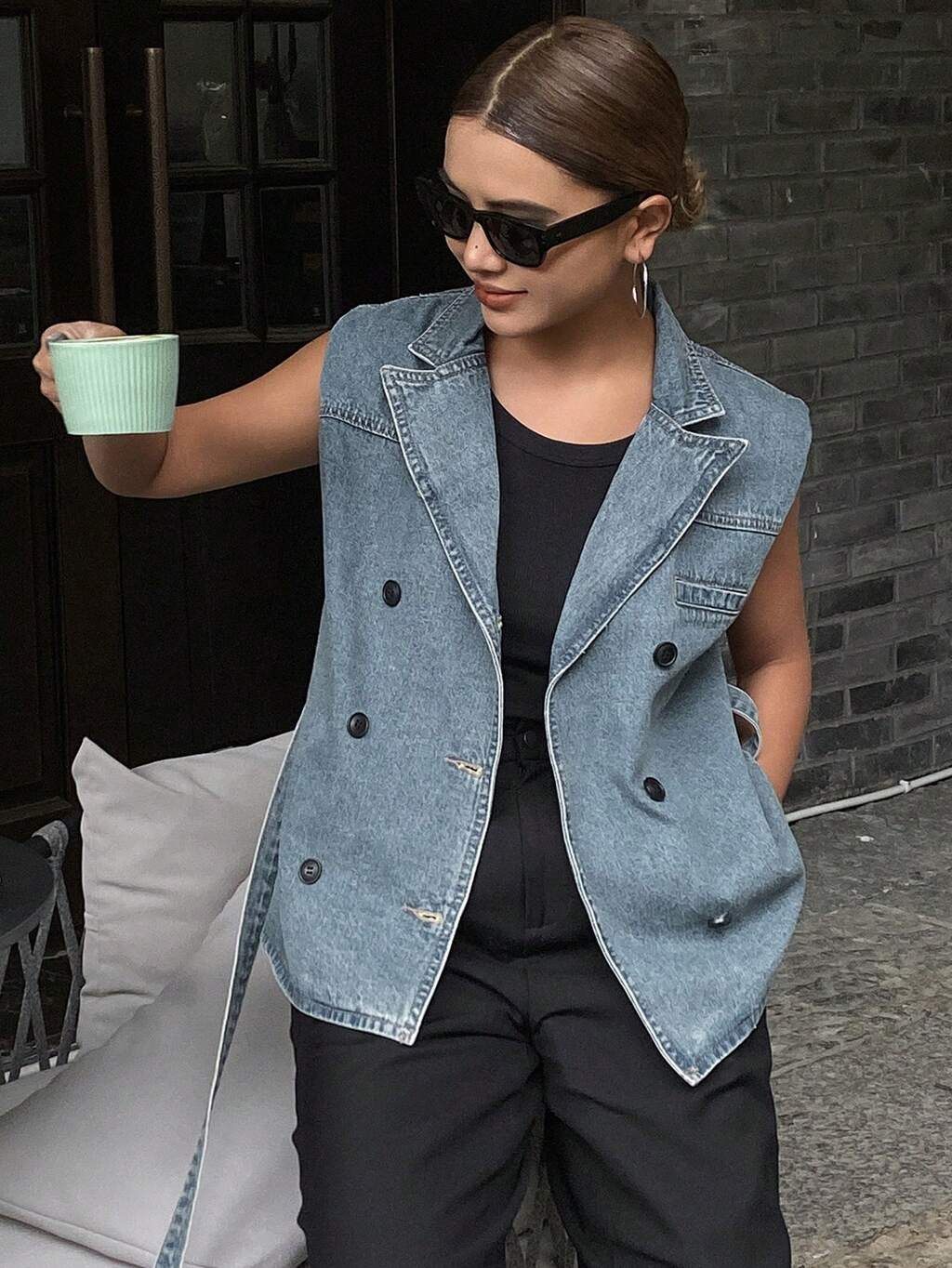 Women's Sleeveless Denim Jacket With Belt, Waist Cinched