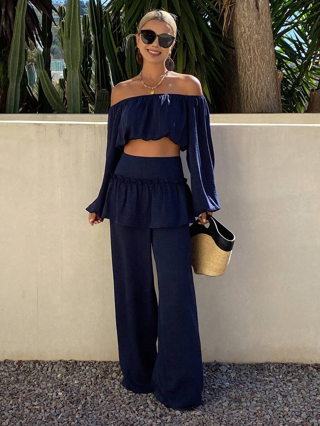 2pcs Women Off-Shoulder Short Blouse & Wide Leg Pants Casual Vacation Outfit, Spring/Summer
