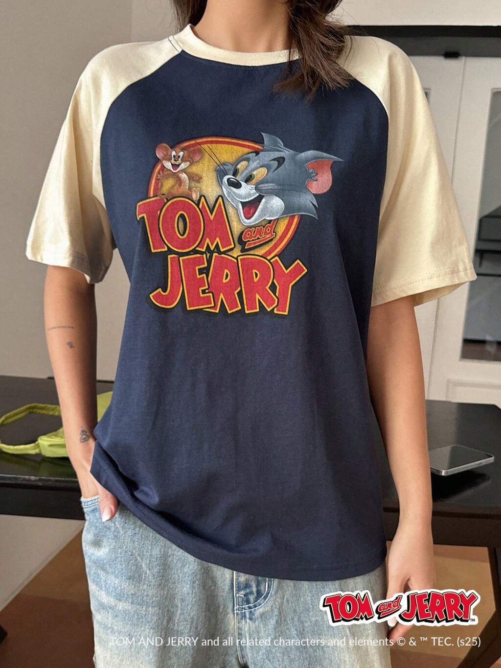 TOM AND JERRY X DAZY 여성 래글런 소매 카툰 그래픽 프린트 대비 색상 티셔츠 귀여운 상의, 선생님