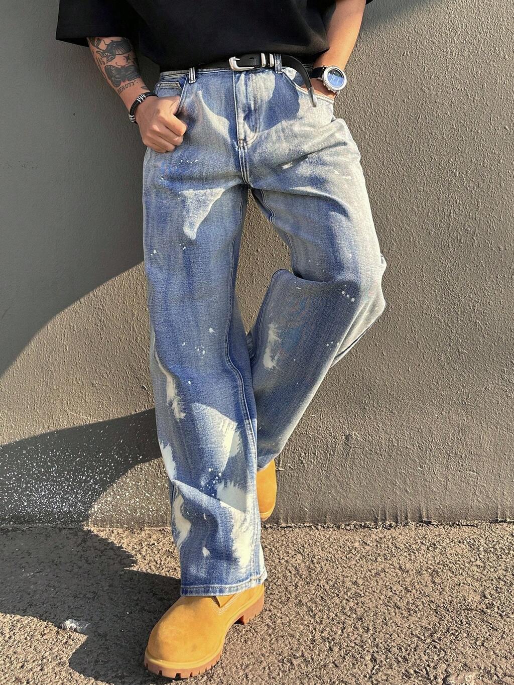春 ダメージ加工 ホワイト スプラッター デザイン ストリートウェア メンズジーンズ