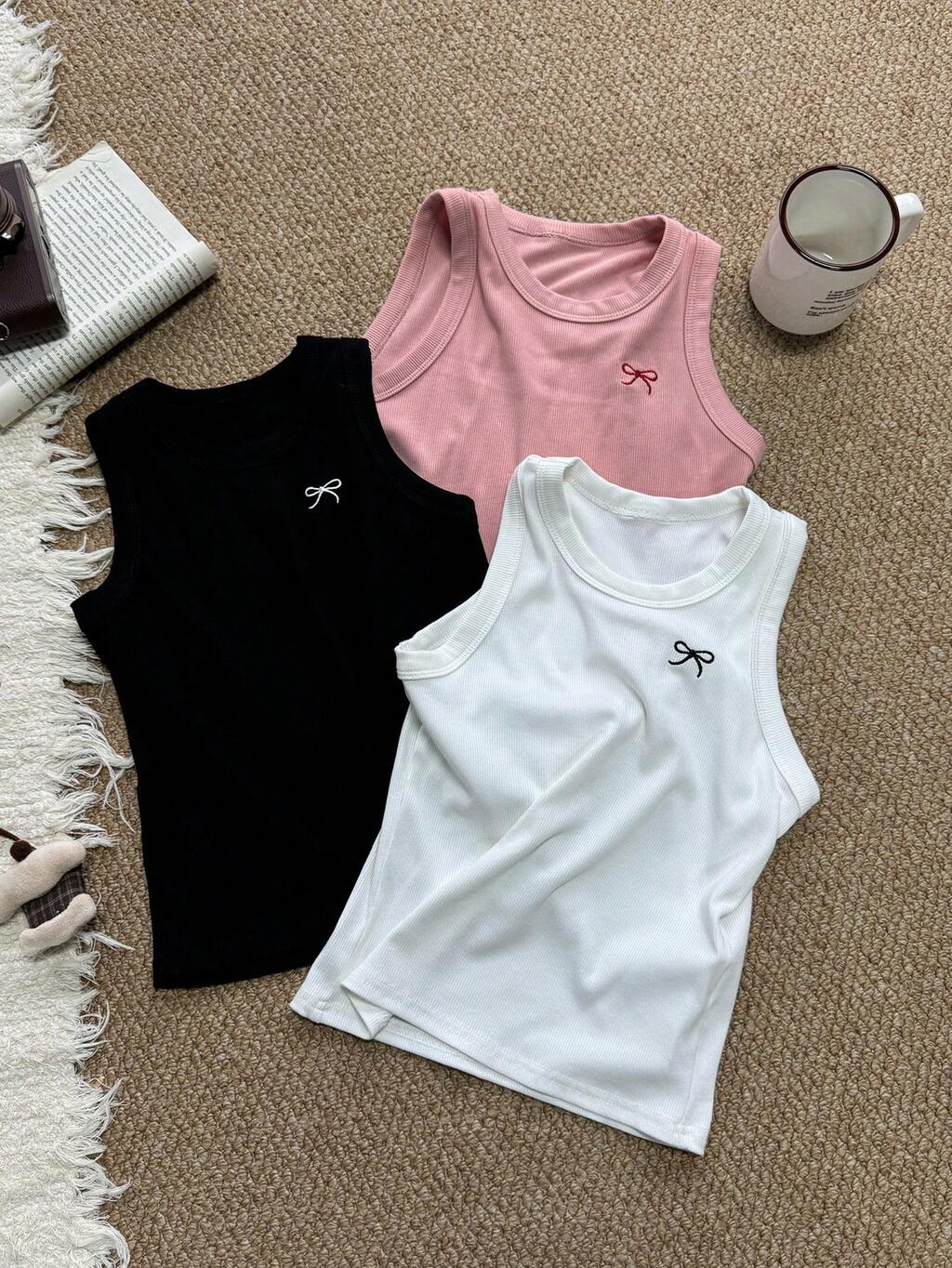 Young Girls Round Neck Fitted Bow Embroidered 3-Color Tank Top Summer