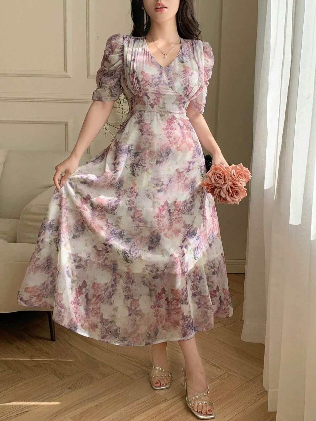 V-Neck Ditsy Floral Waist Cinched Long Dress, Fashionable & Age-Reducing Sundress