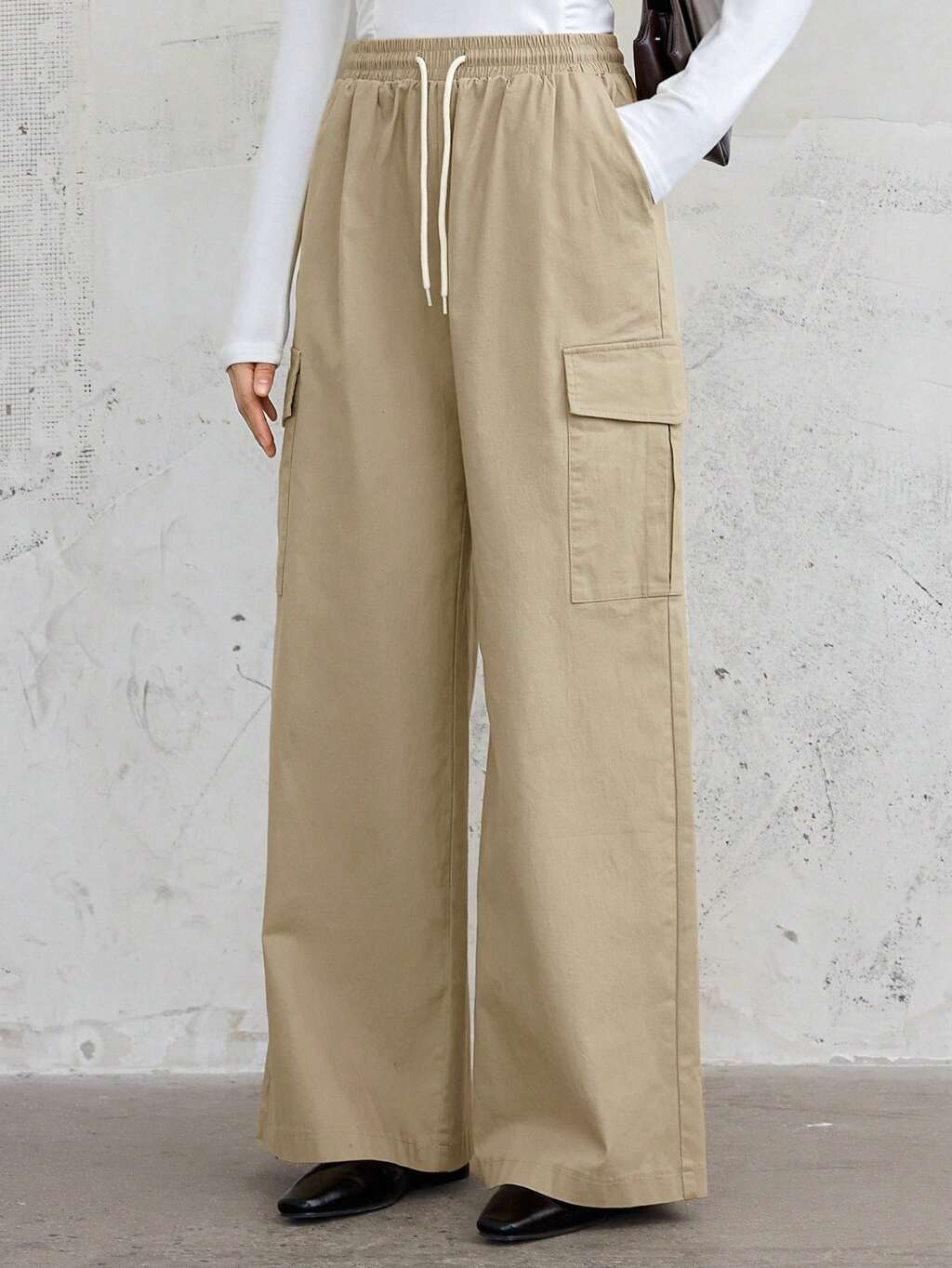 Calça cargo feminina esportiva em cor sólida com cintura de elástico e pernas largas com cordão