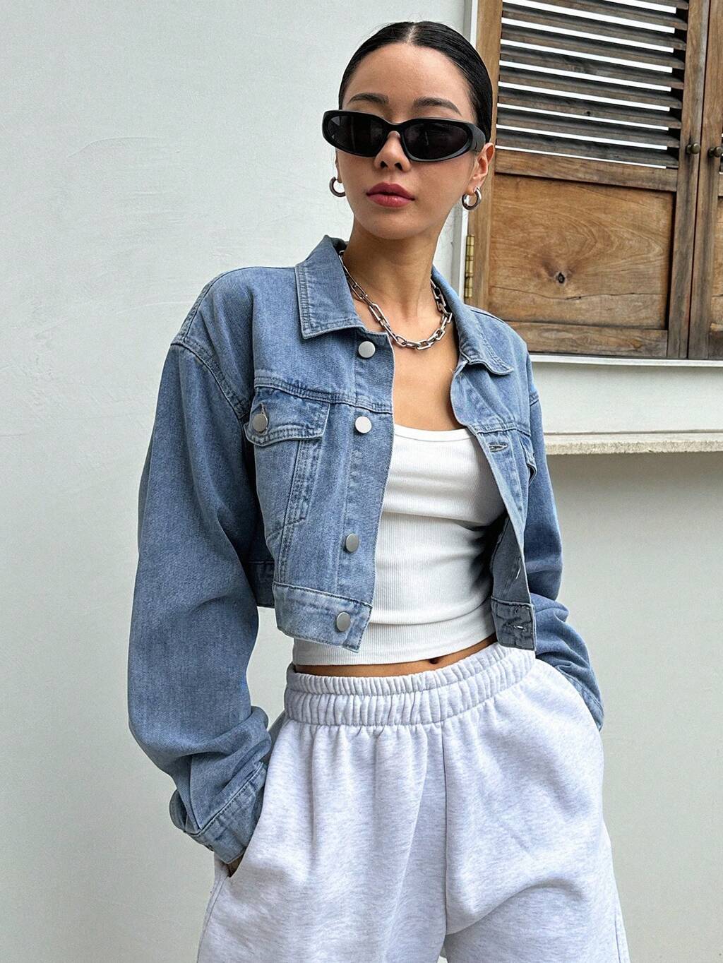 Flap Pocket Drop Shoulder Crop Denim Jacket,Fall Clothes