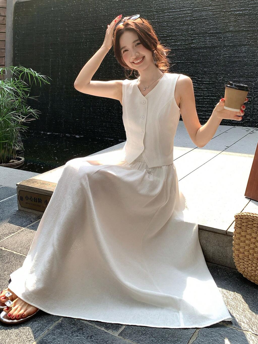 Women's Collared Sleeveless Solid Color Blouse And Loose Casual Skirt 2-Piece Set, Korean Style