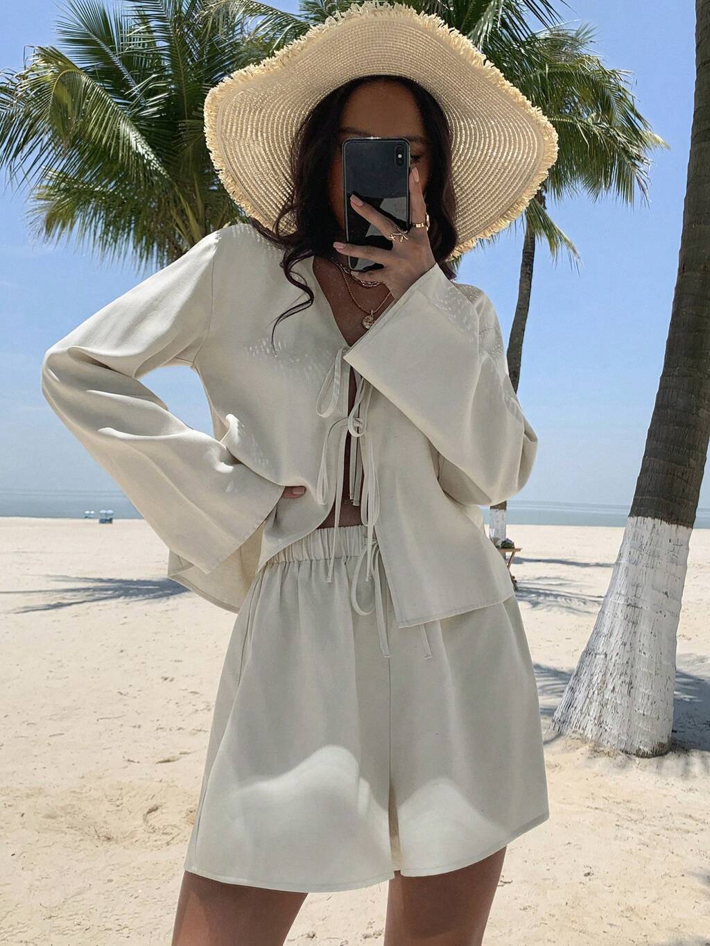 2pcs/Set Women's Casual Front-Tie Sleeveless Top And Skirt Set Linen