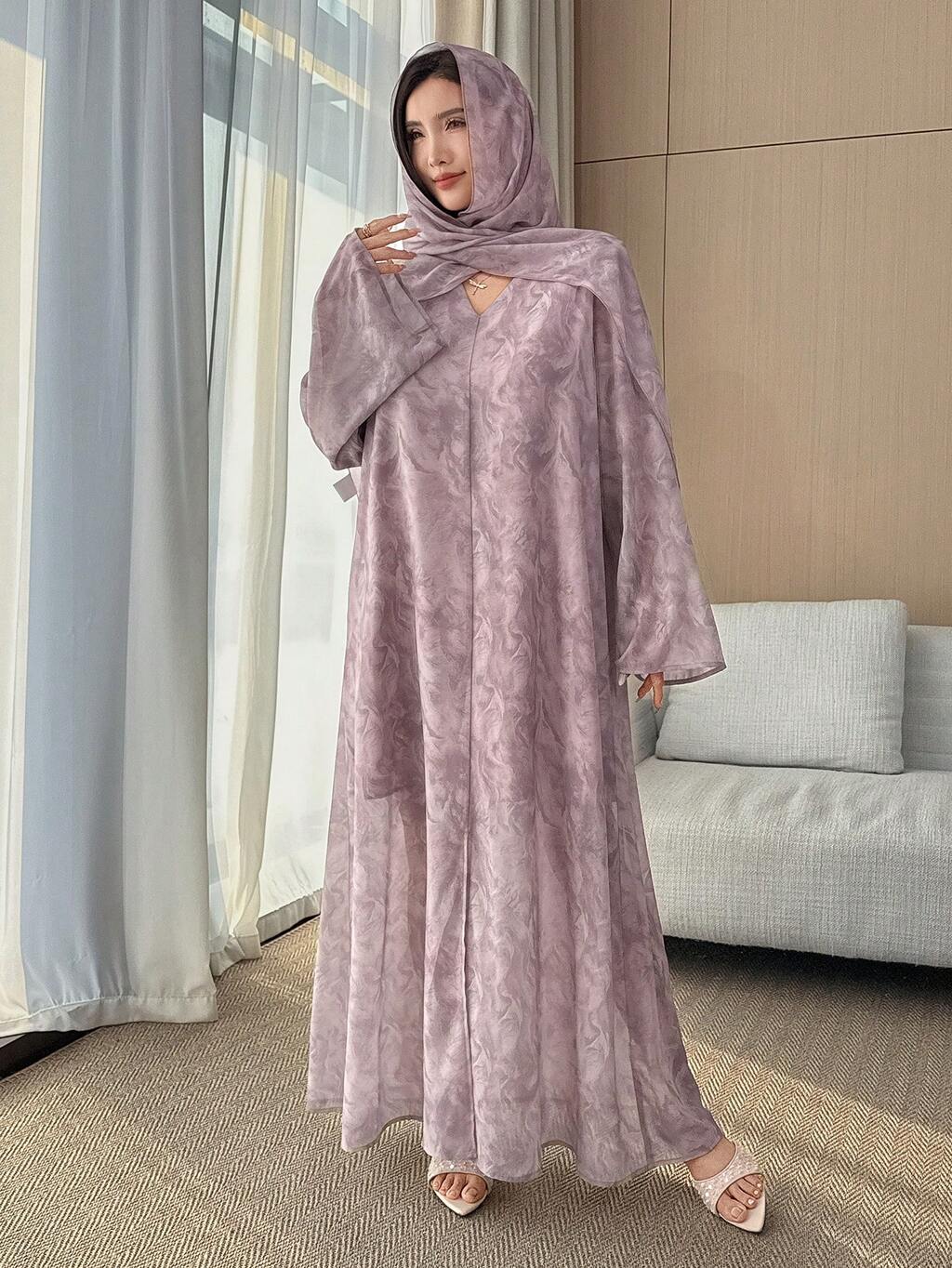 Women's Elegant Floral Print V-Neck Loose Dress With Headscarf 2 Pieces Set, Spring/Summer,Wedding Guest Dress Women