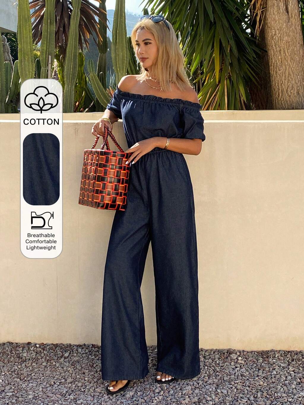 Women's Elegant Solid Color Washed Off Shoulder Ruffle Hem Denim Jumpsuit, Spring/Summer