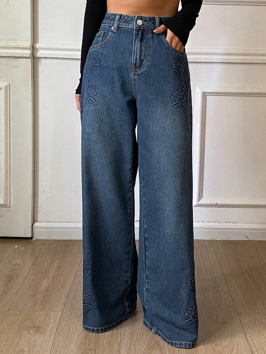 Women's Loose Straight Leg Jeans With Western Cowgirl Floral Embroidery And Distressed Wash, Casual Autumn/Winter Pants