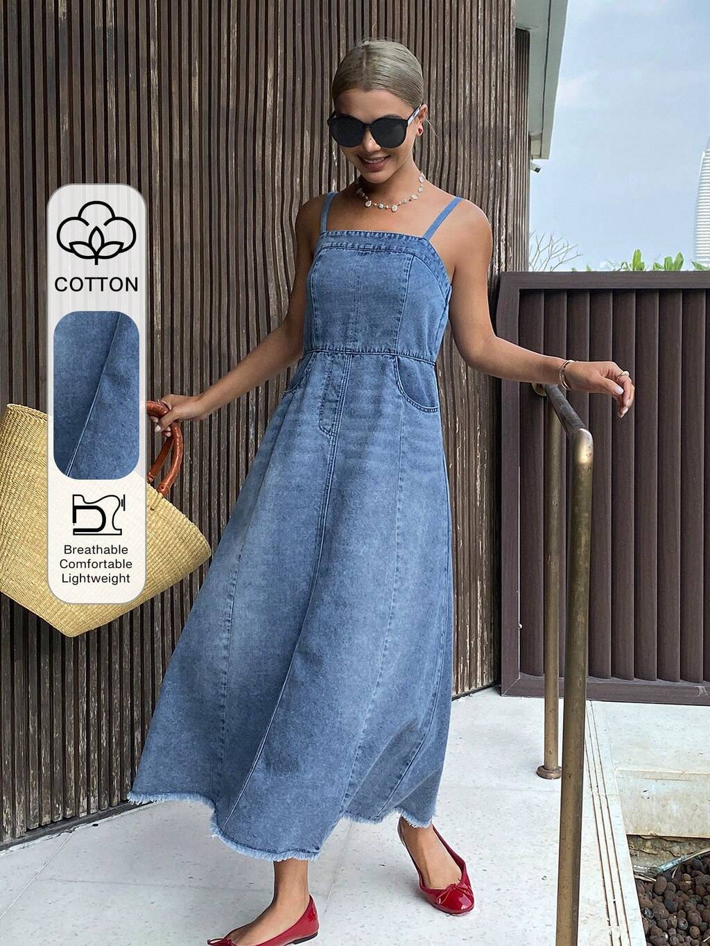 Women's Casual Washed Pocket Strap Denim Dress, Summer