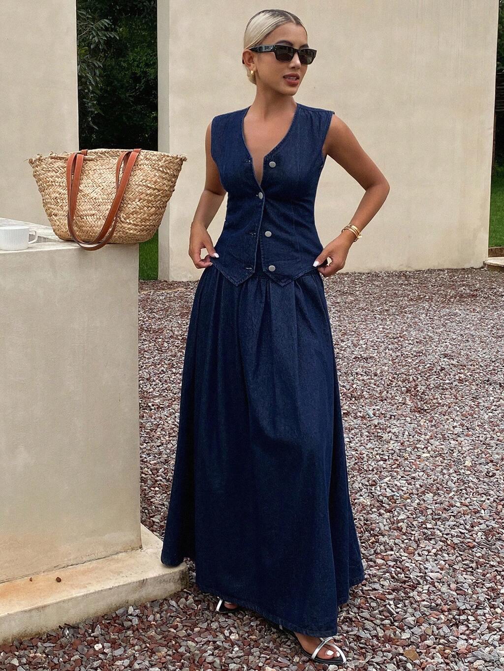 Women's Solid Color Fitted V-Neck Sleeveless Long Vest & Pleated A-Line Skirt Casual Resort Outfit, Spring/Autumn