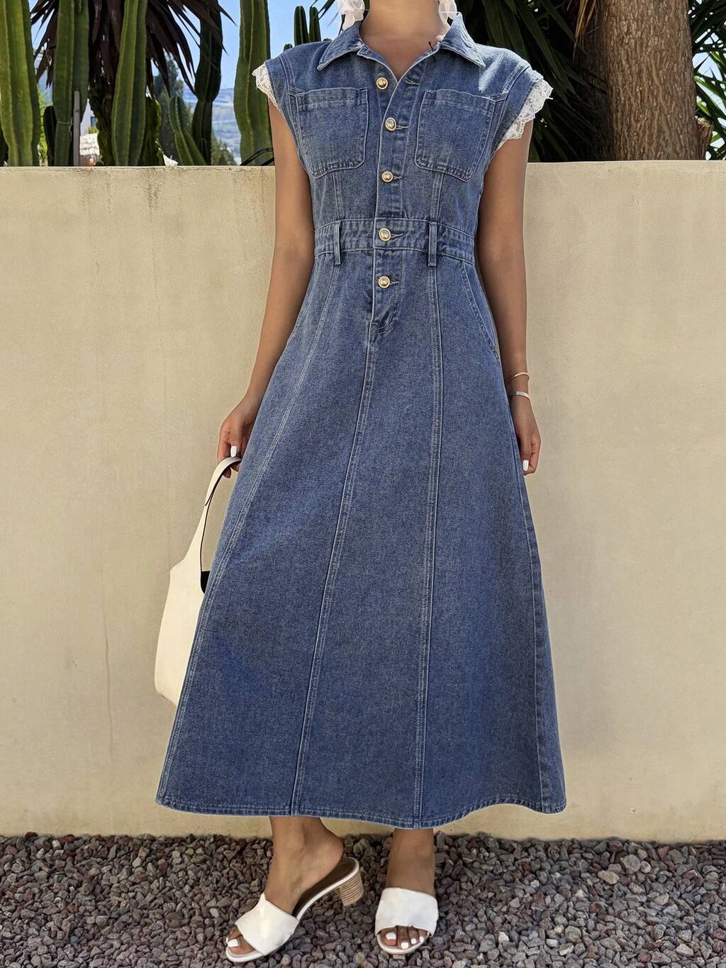 Distinctive Lace Patchwork Sleeve Waist Cinched Denim Dress For Women Summer