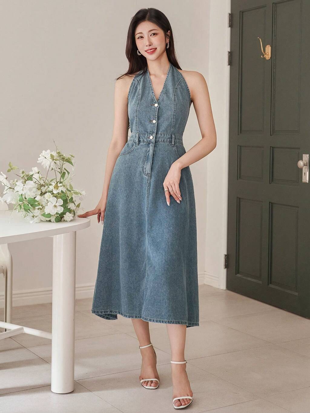Washed V-Neck Halter Sleeveless Women's Denim Dress