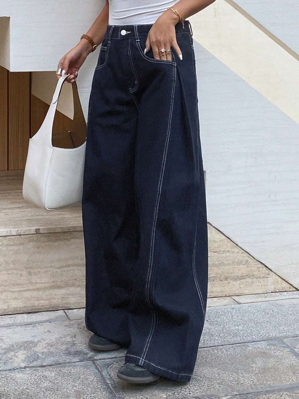Women's Regular Waist Pleated Pocket Decor Loose Wide Leg Jeans, Casual City Style
