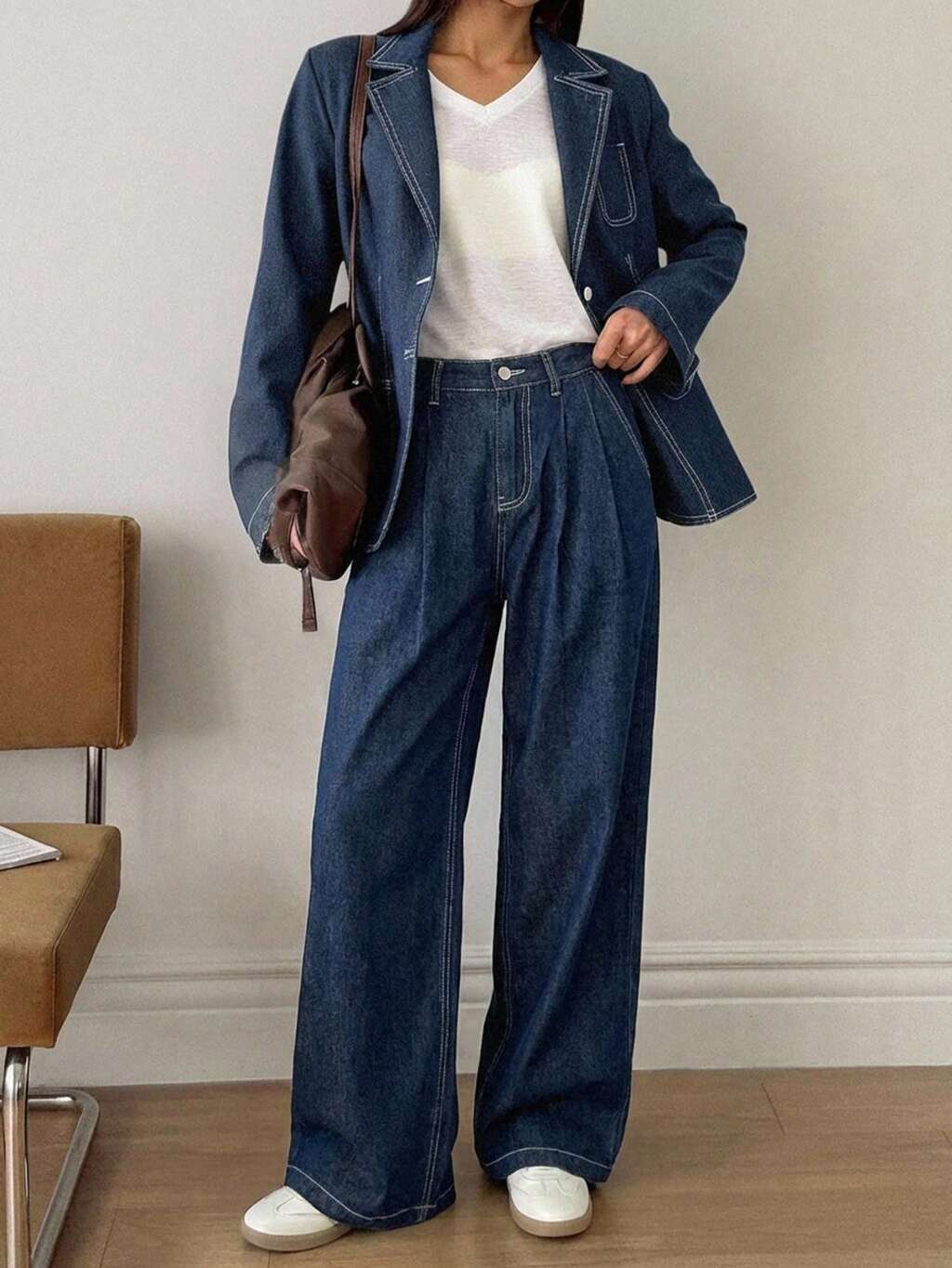 Women Casual Fashion Single-Breasted Denim Shirt And Loose Wide-Leg Jeans Set