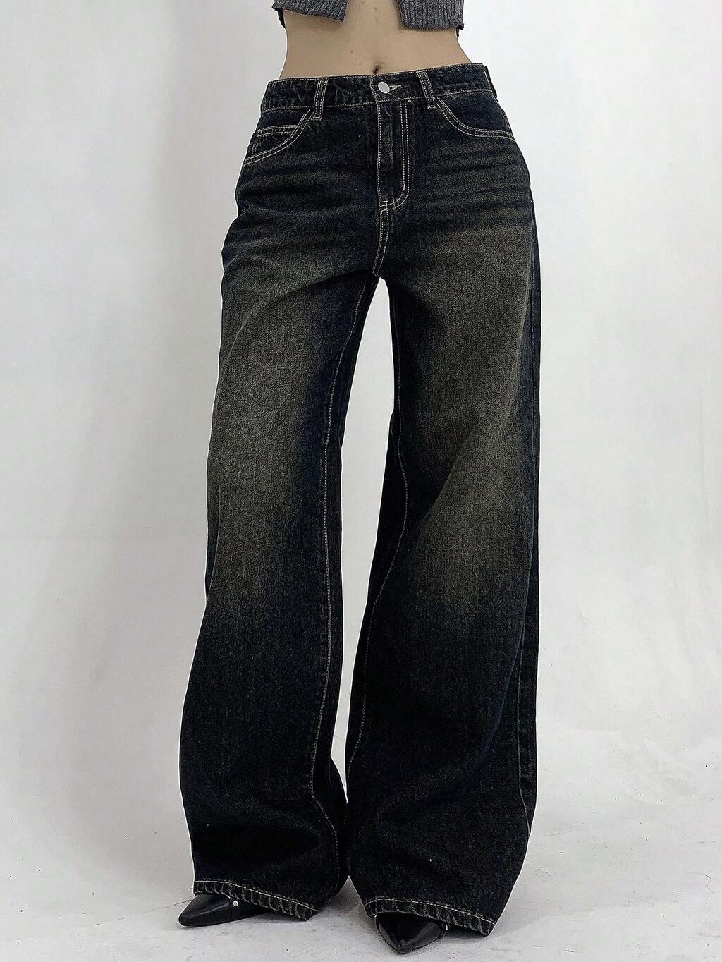 Women's Regular Waist Pleated Loose Wide Leg Jeans, Casual Street Style Y2k