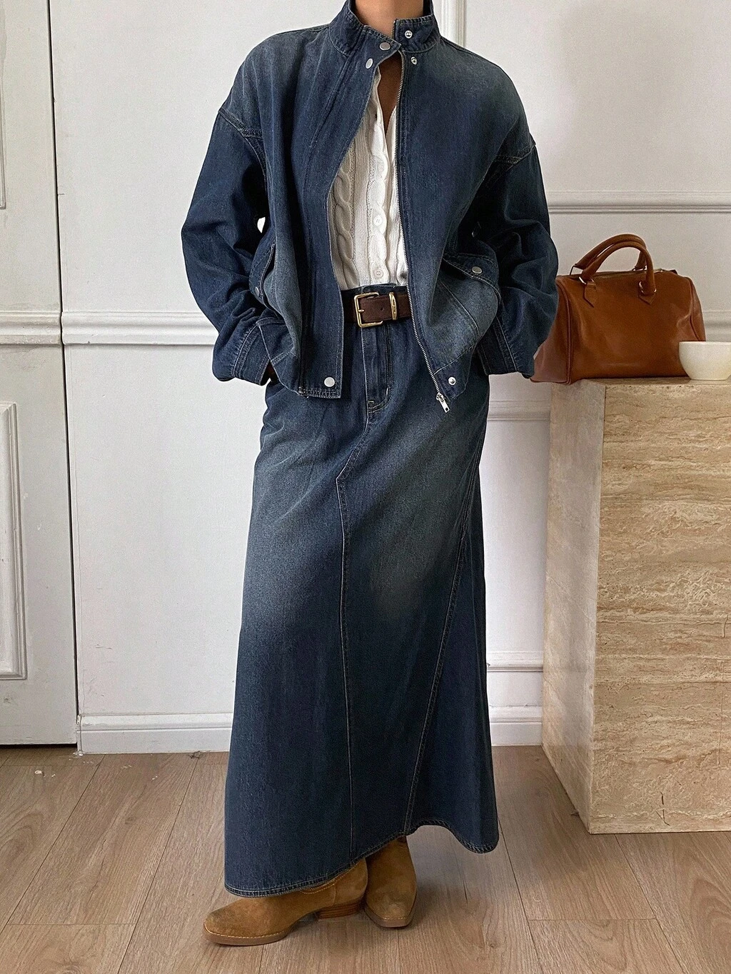 Western Cowgirl Distressed Wash High Collar Long Sleeve Zip Up Loose Jacket & Asymmetric Hem Skirt Casual Street Outfit, Autumn/Winter