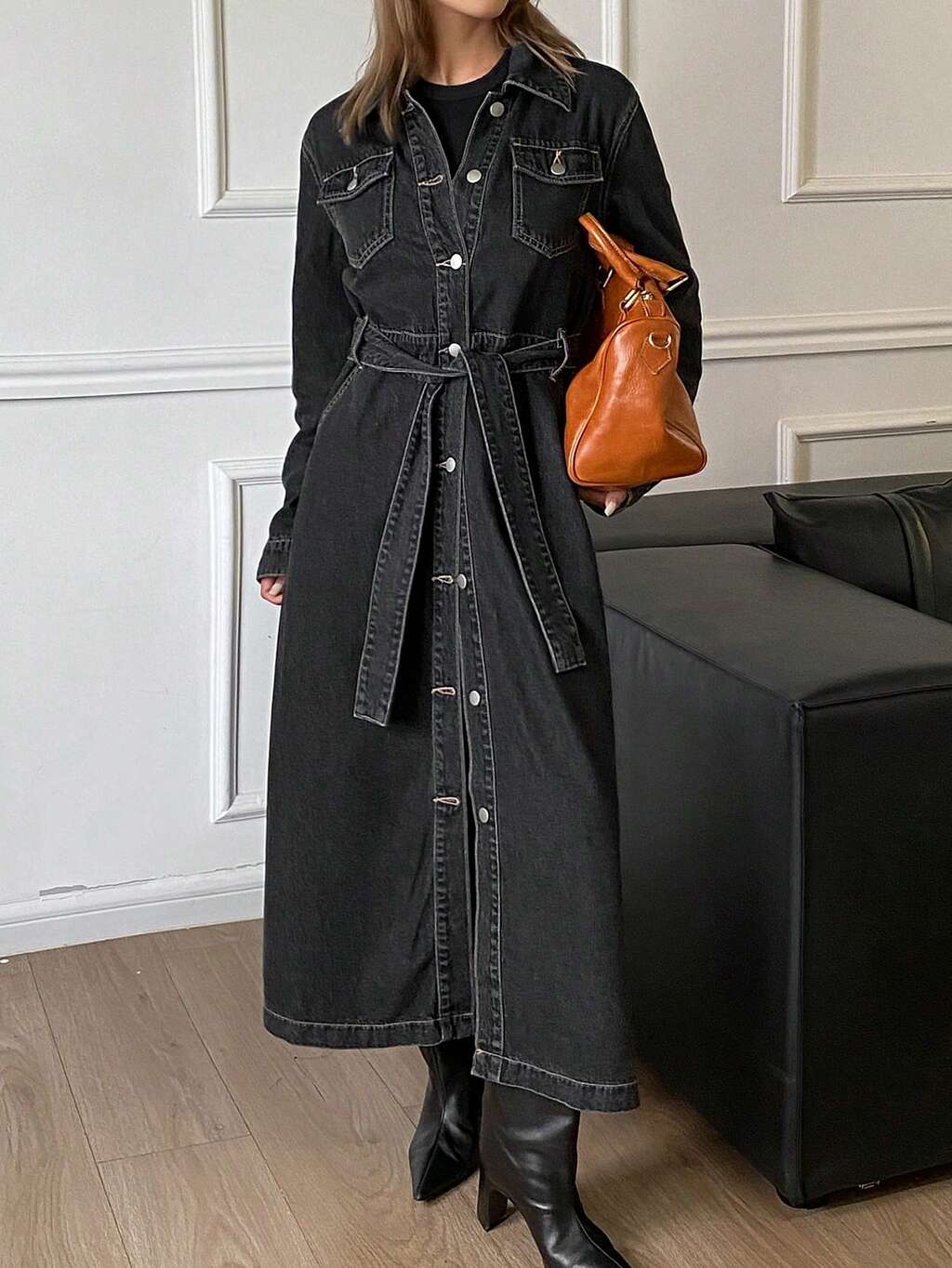 Women's Casual Washed Pocket Belt Denim Dress, Autumn