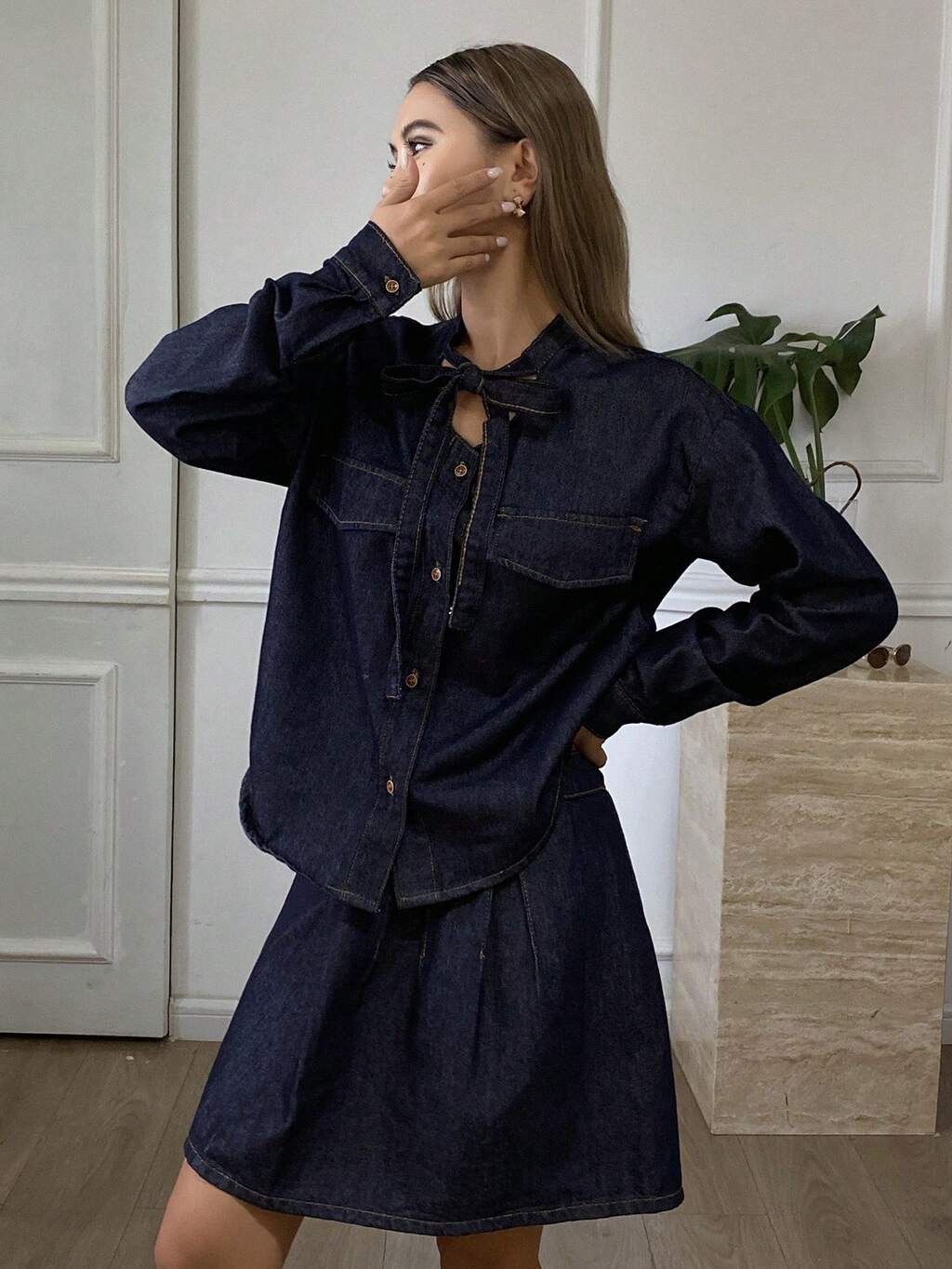 Western Cowgirl Vintage Casual Set, Long Sleeve Loose Tie Collar Shirt And Pleated Mini Skirt Women Denim Suit