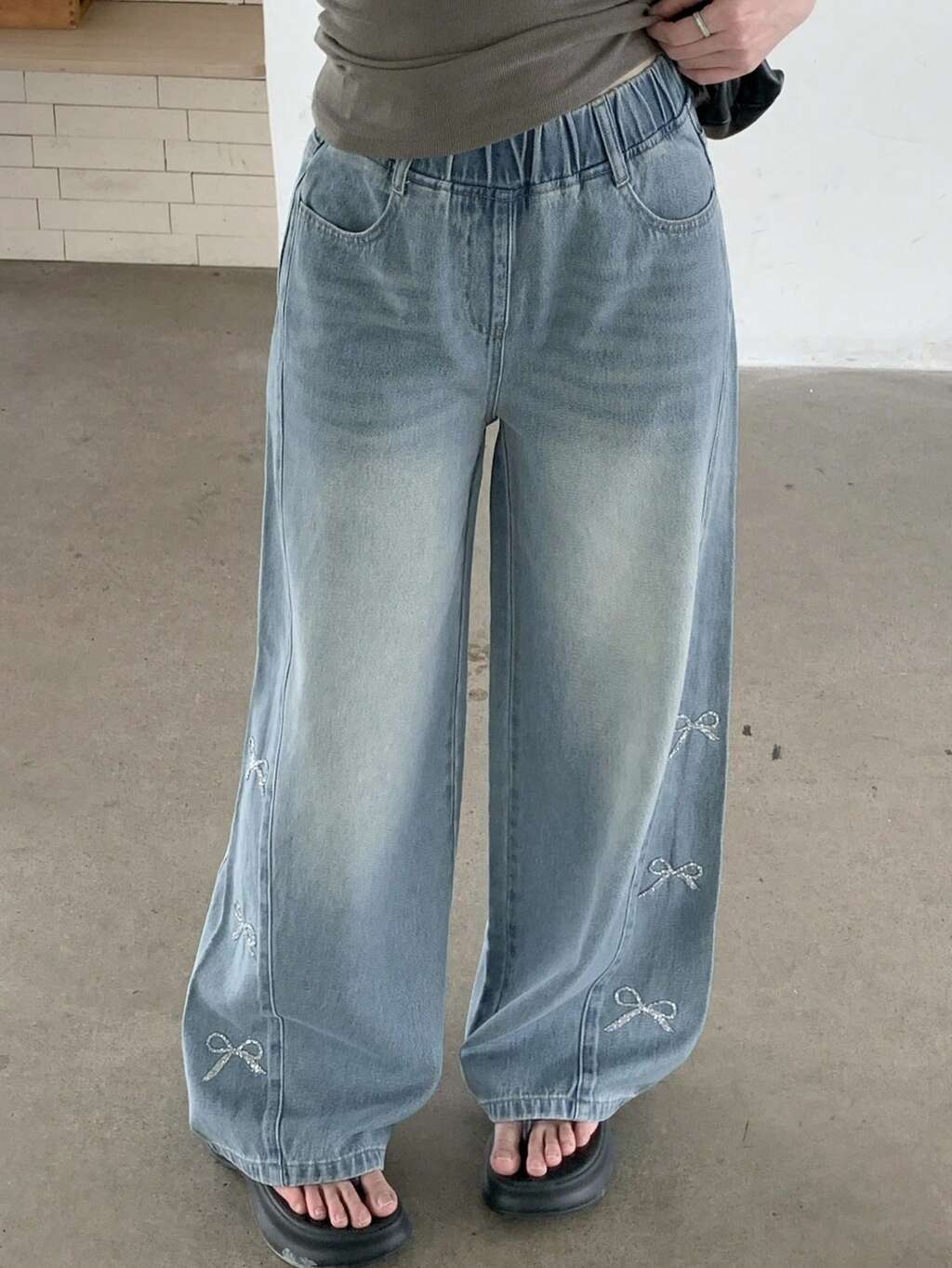 Women's Low Waist Bow Letter Rhinestone Loose Straight Leg Jeans, Casual Denim Pants