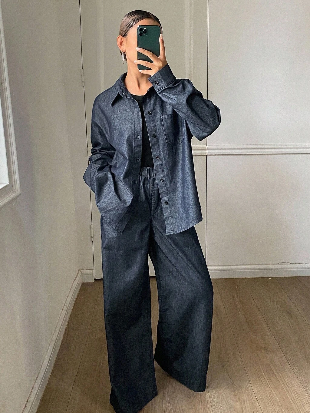 Women's Loose Denim Shirt With Lapel And Side Button Design, And Straight-Leg Denim Pants Casual Suit
