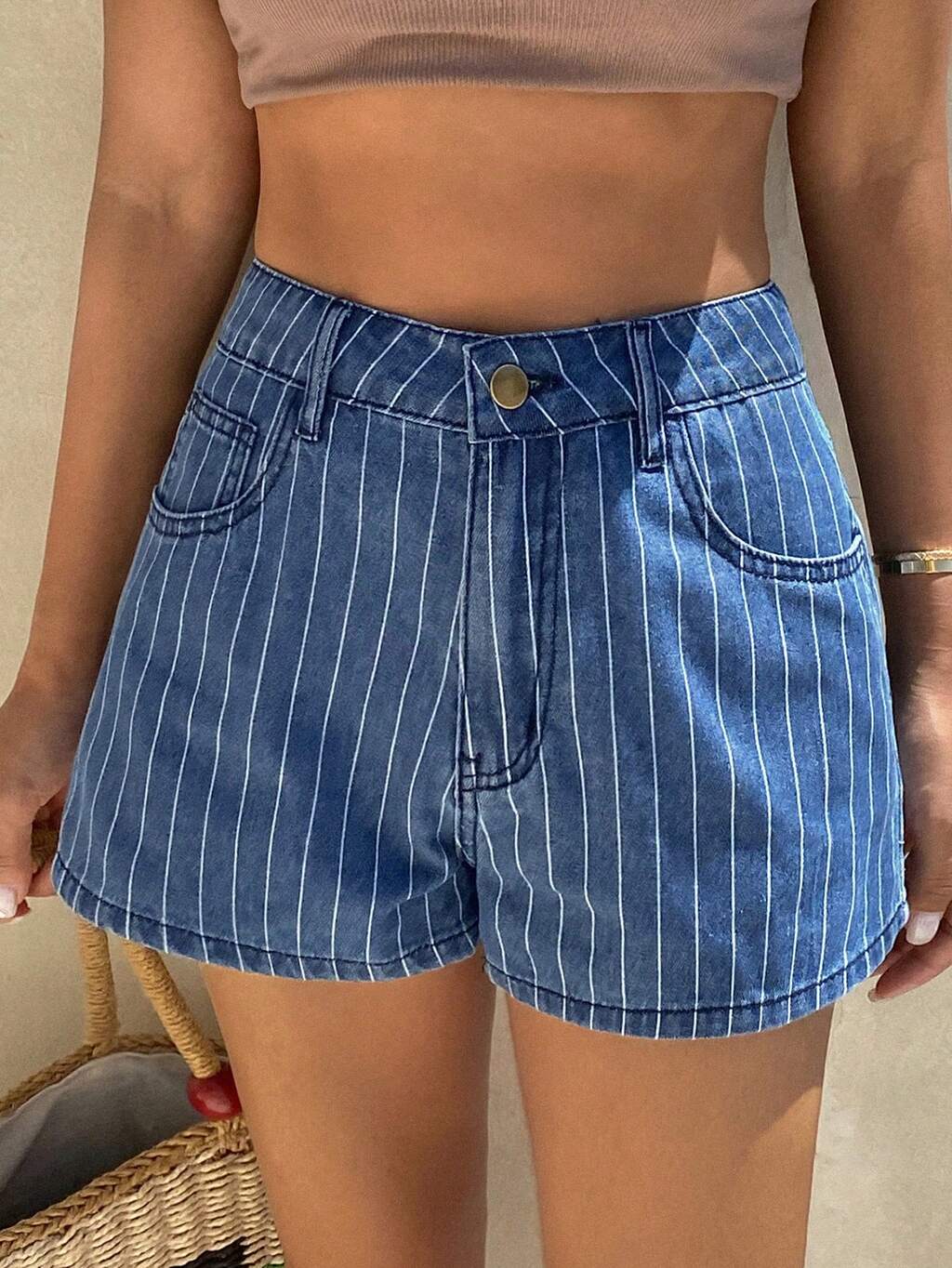 Women's Striped High Waist Pockets Loose Casual Denim Shorts