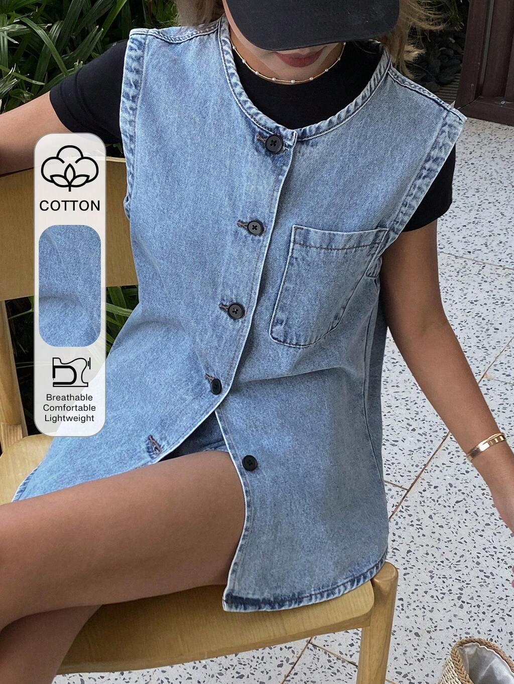 Women's Round Neck Sleeveless Pocket Decor Open Front Casual Washed Denim Blouse