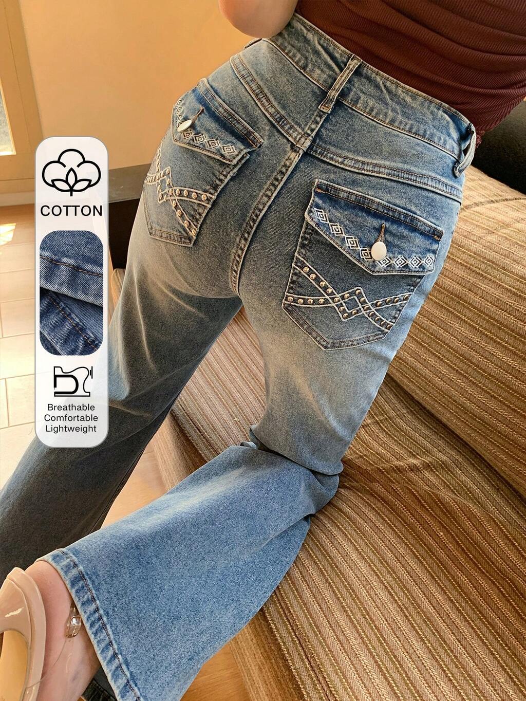 Women's Distressed Wash Flare Leg Casual Jeans, Summer Western Cowgirl Style
