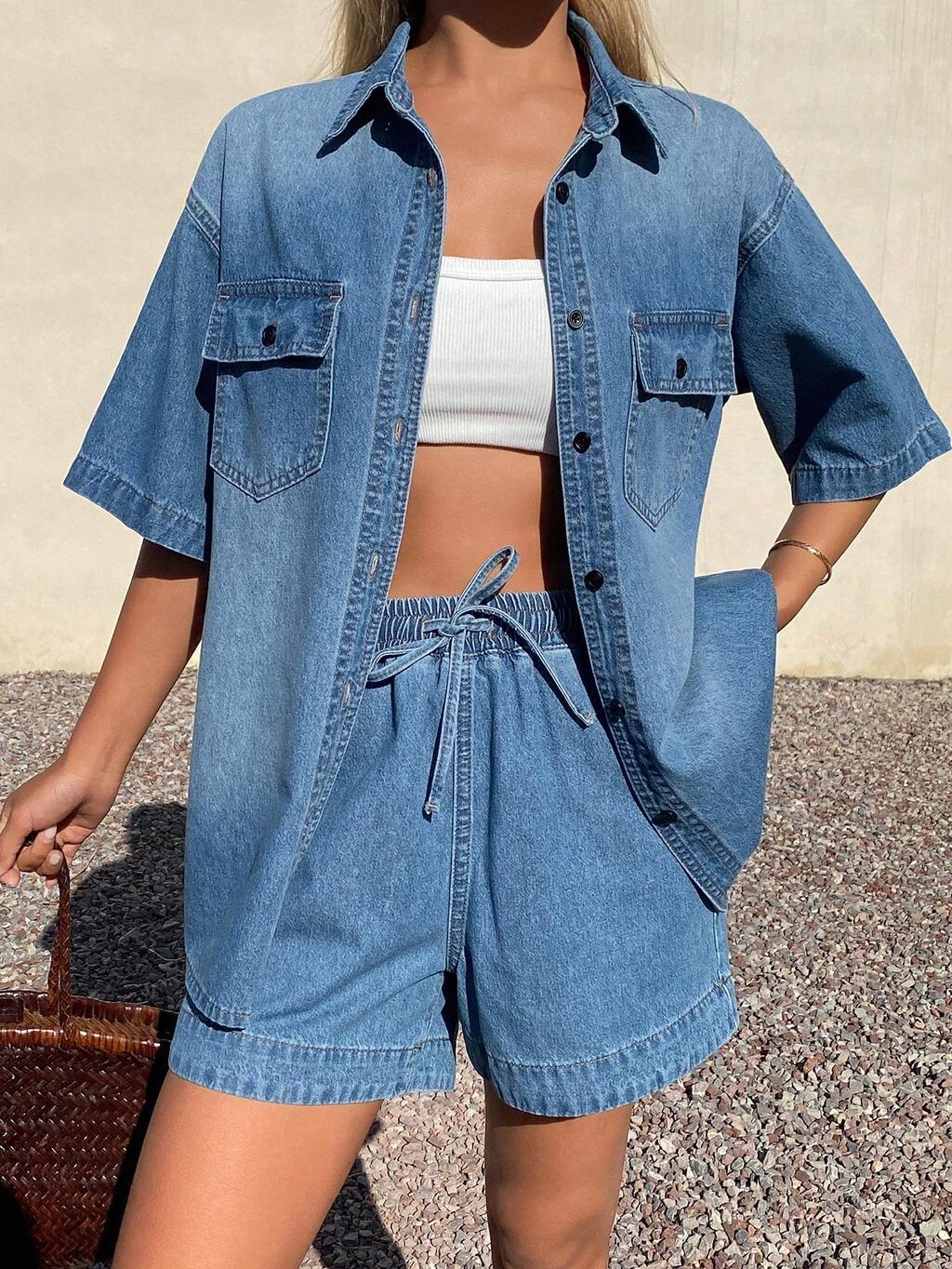 Women's Turndown Collar Pocket Decor Loose Open Front Denim Shirt And Knee-Length Shorts Casual Denim Set
